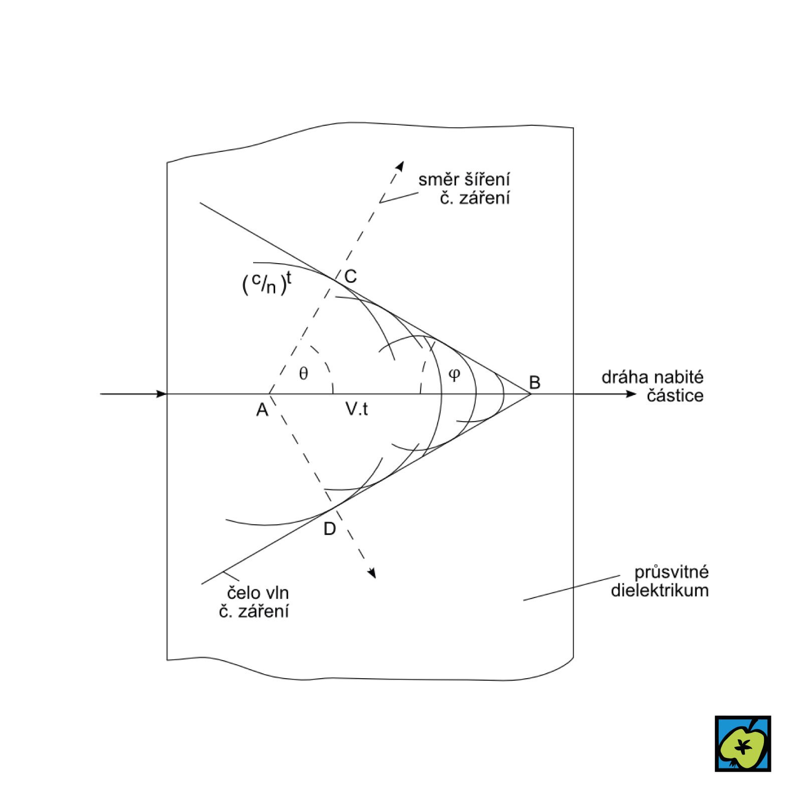 \(\cos \theta = \frac{c}{n \cdot v}\) , kde c je rychlost světla ve vakuu.