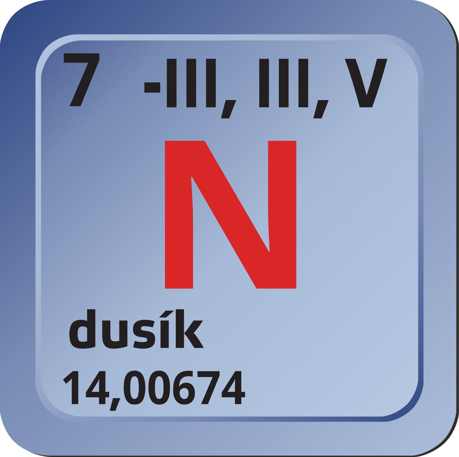 Nitrogenium, značka N, chemický prvek V.A skupiny periodické soustavy, protonové číslo 7, relativní atomová hmotnost 14,0067. Bezbarvý plyn, bez zápachu a bez chuti, za běžných podmínek nereaktivní, lehčí než vzduch, teplota tání -210,5 °C, teplota varu 195,82 °C. Objeven byl roku 1772. Vyskytuje se zejména jako součást vzduchu, který ho obsahuje 78,1 objemových %, tj. 75,5 hmotnostních %. Dusík se připravuje například tepelným rozkladem dusitanu amonného NH4NO2. Průmyslově se získává zkapalněním a frakční destilací vzduchu. Používá se například jako inertní plyn, k výrobě dusíkatého vápna, amoniaku, kyseliny dusičné. V přírodě je důležitým biogenním prvkem (vázání vzdušného dusíku mikroorganismy, organické sloučeniny dusíku). Ve sloučeninách má dusík oxidační číslo -III až V. Významnými sloučeninami dusíku jsou například amidy, aminy, amoniak, amoniakáty, dusičnany, dusitany, hydrazin, hydroxylamin, kyselina dusičná, nitridy.