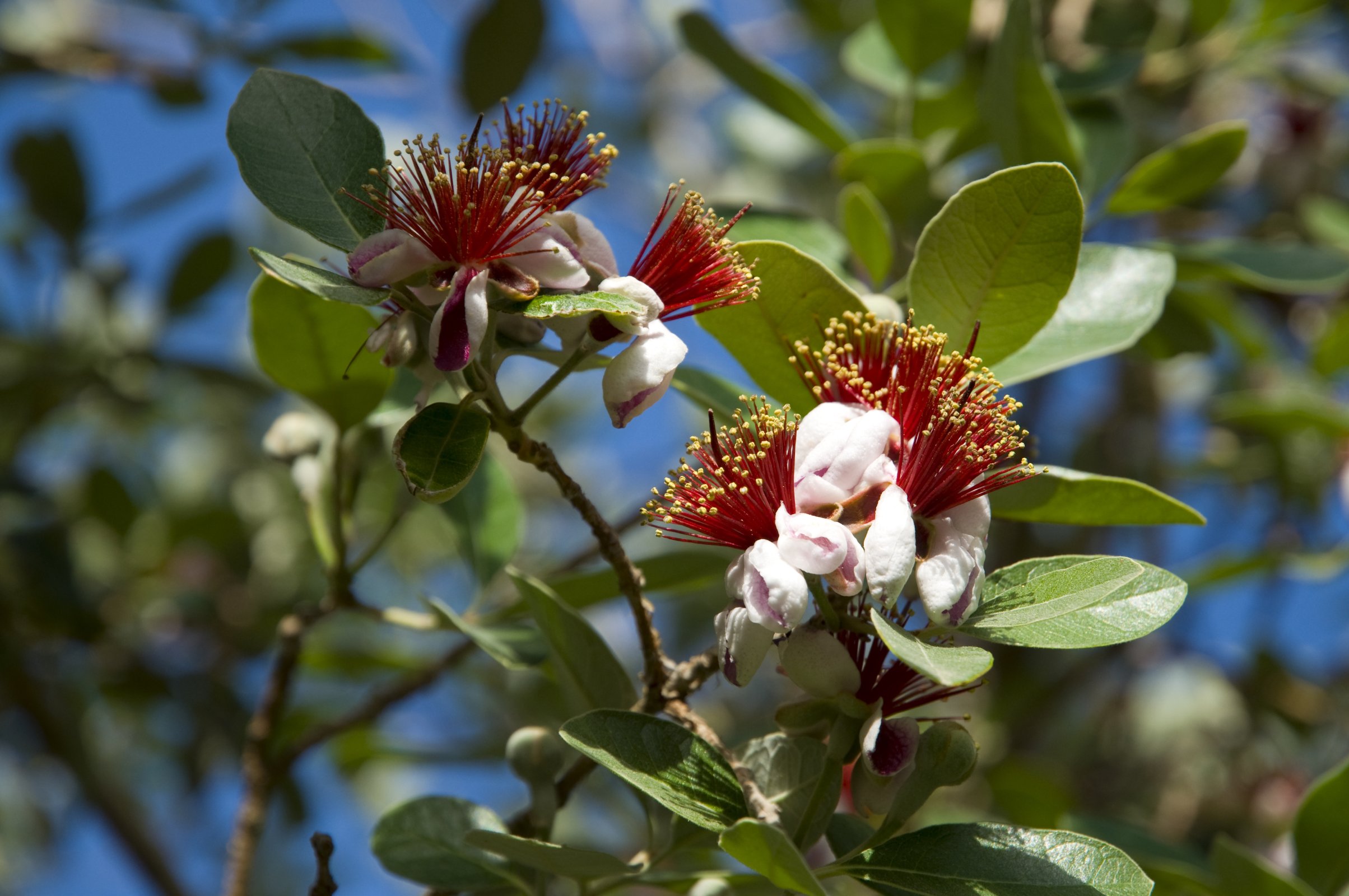 [Španělština], Feijoa sellowiana – vždyzelený subtropický keř z čeledi myrtovitých, původně z Jižní Ameriky. Pěstuje se pro plody příjemně navinulé chuti, jedlé jsou i dužnaté korunní plátky květů.