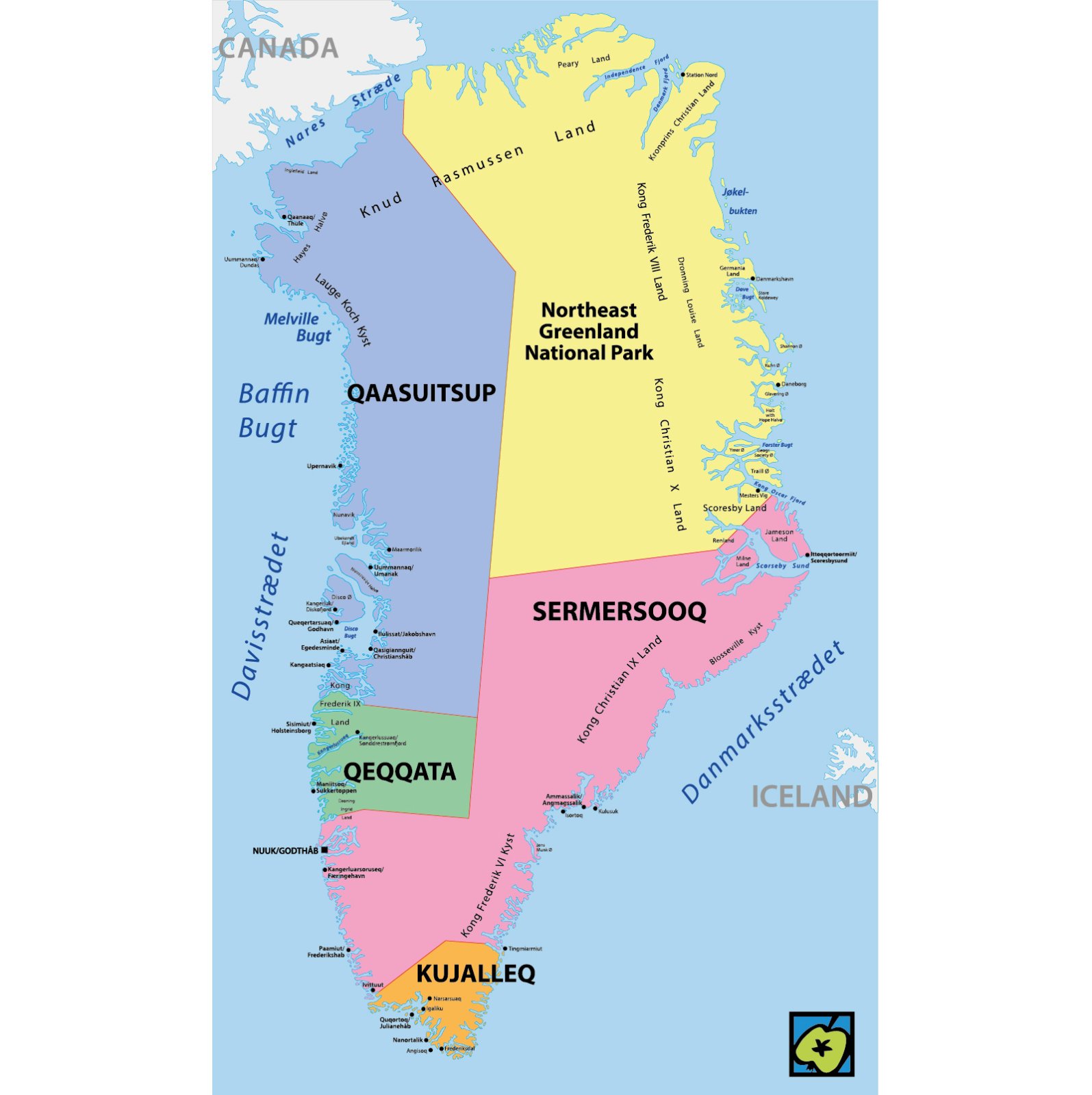 Odkazující hesla: Atlantský oceán, Baffinův záliv, Bjarni Herjulfsson, Dorset, eskymácko-aleutské jazyky, Fridtjof Nansen, Grónské moře, Hans Egede, Ittoqqortoormiit, Kanadský štít, Labradorské moře, Lincolnovo moře, Markéta II., mys Farvel, Mys Morrise Jesupa, Norové, Norské moře, Nuuk, Otto Gustav Nordenskjöld, pevninský ledovec, Qaanaaq, Robert Edwin Peary, Scoresbyho záliv, Severní Amerika, Severní ledový oceán, Severovýchodní Grónsko, telení ledovců, Thule.