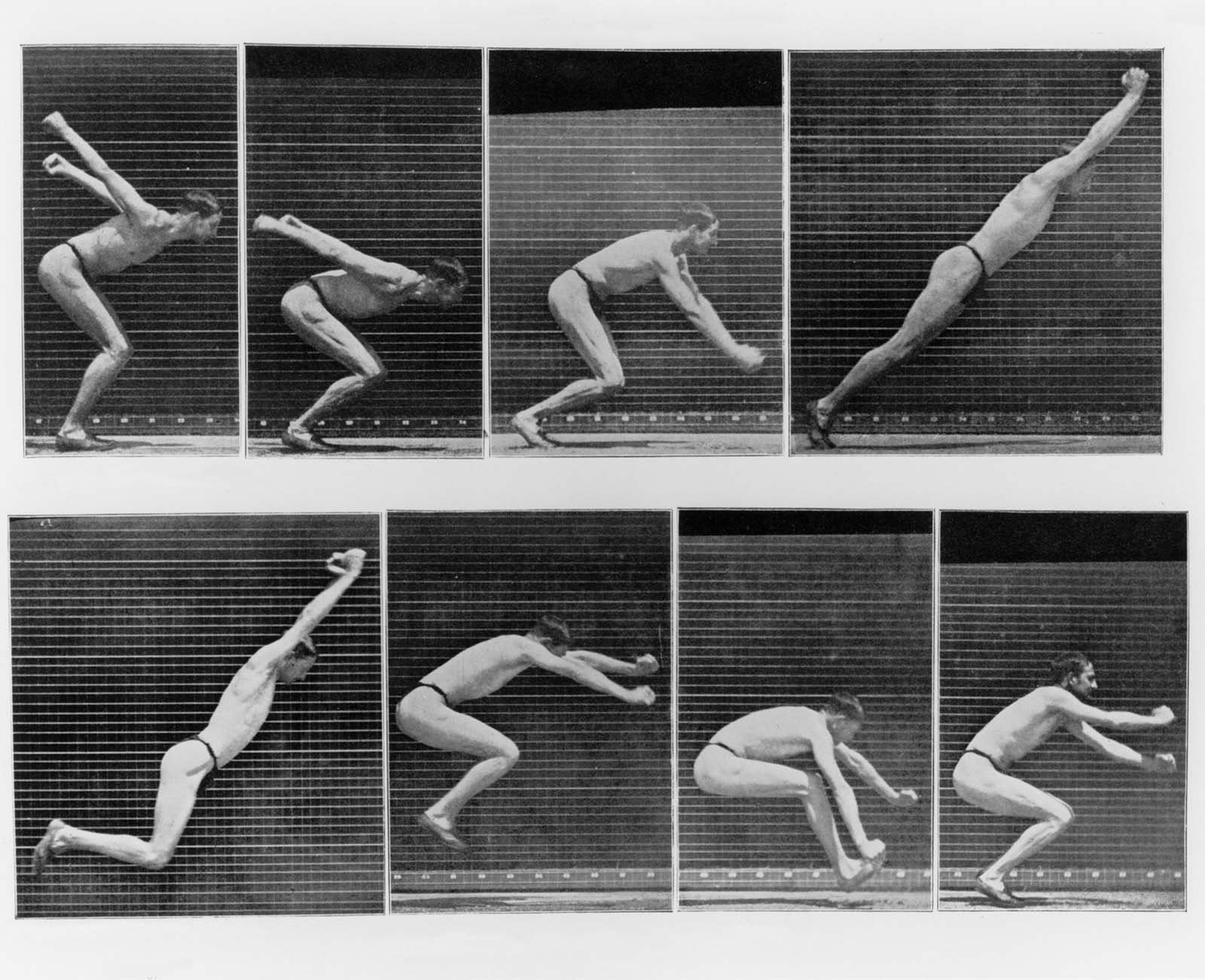 Kinogram: „Some phases of a standing longjump“ (fáze skoku z místa), 1887, fotografická reprodukce z knihy E. Muybridge: The Human Figure in Motion. An Electrophotographic Investigation (Lidská postava v pohybu. Elektrofotografický výzkum), 3. vydání, Londýn (Chapman & Hall) 1907, s. 203 – Profimedia.CZ