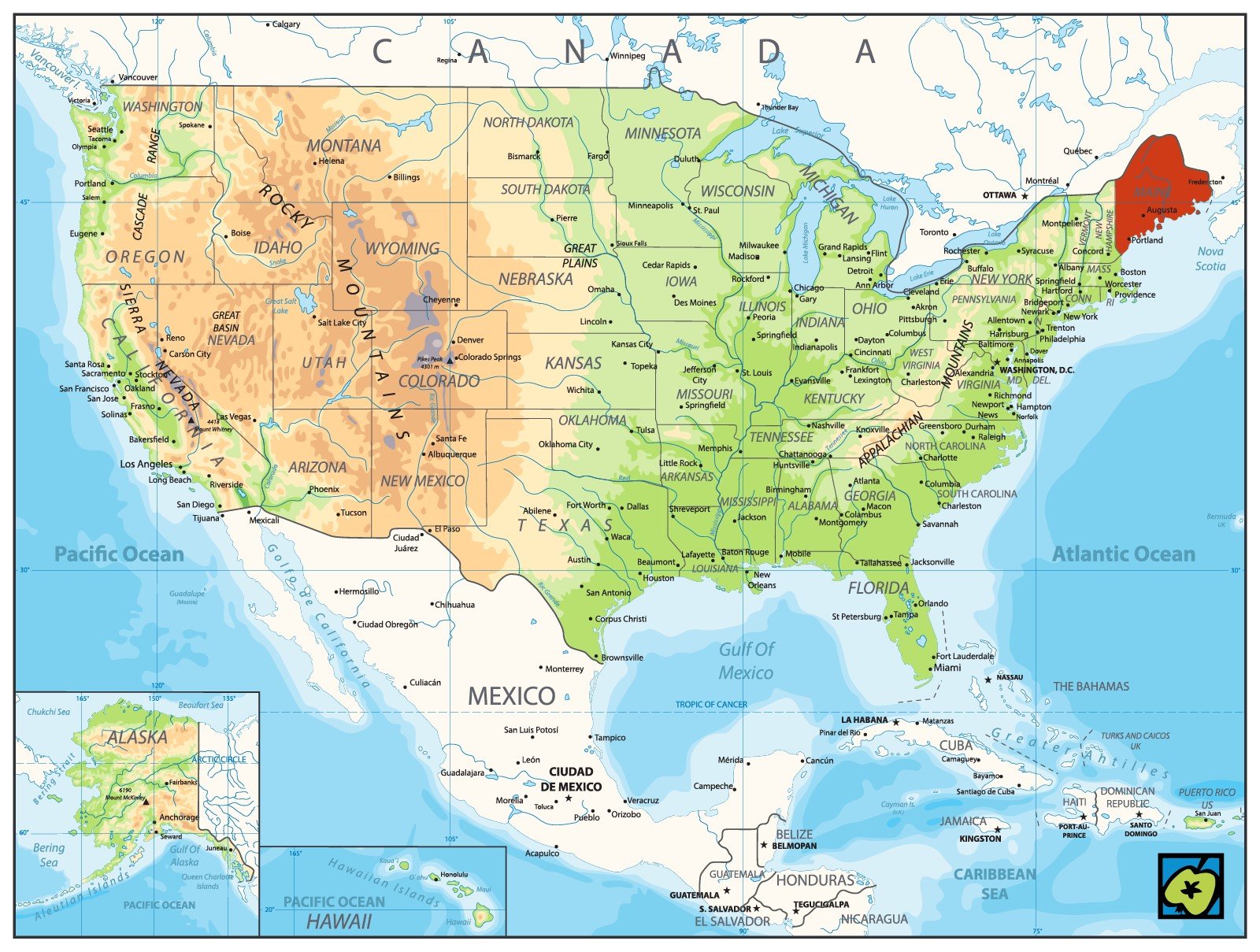 [Mejn], zkratka Me. – členský stát USA na severu atlantského pobřeží USA, nejsevernější ze států Nové Anglie u hranic Kanady. Má 86027 km2, 112 miliónů obyvatel.(1980), hlavní město Augusta. Členité pobřeží, ve vnitrozemí výběžky Appalačských hor. Průmysl je zde těžební (beryl, slída, živce), dřevozpracující, papírnický, textilní, loďařský. Zemědělství se zelinářstvím a ovocnářstvím. V Kongresu USA má 2 senátory a 2 poslance. V roce 1497 přistál u pobřeží dnešního Maine G.Caboto a dal tak základ anglickým územním nárokům. Francouské pokusy o osídlení na začátku 17. století byly neúspěšné, od 30. let 17. století osídlení angličany. V roce 1677 Maine získala Massachusetts Bay Company. Stal se součástí kolonie a státu Massachusetts a 1820–23 státem USA.