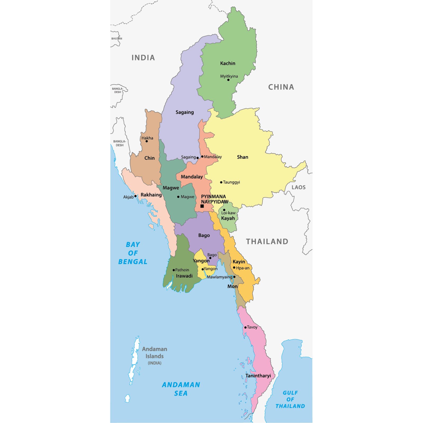 Hlavní město: Yangón (Rangoon) 3851 tis. obyvatel.