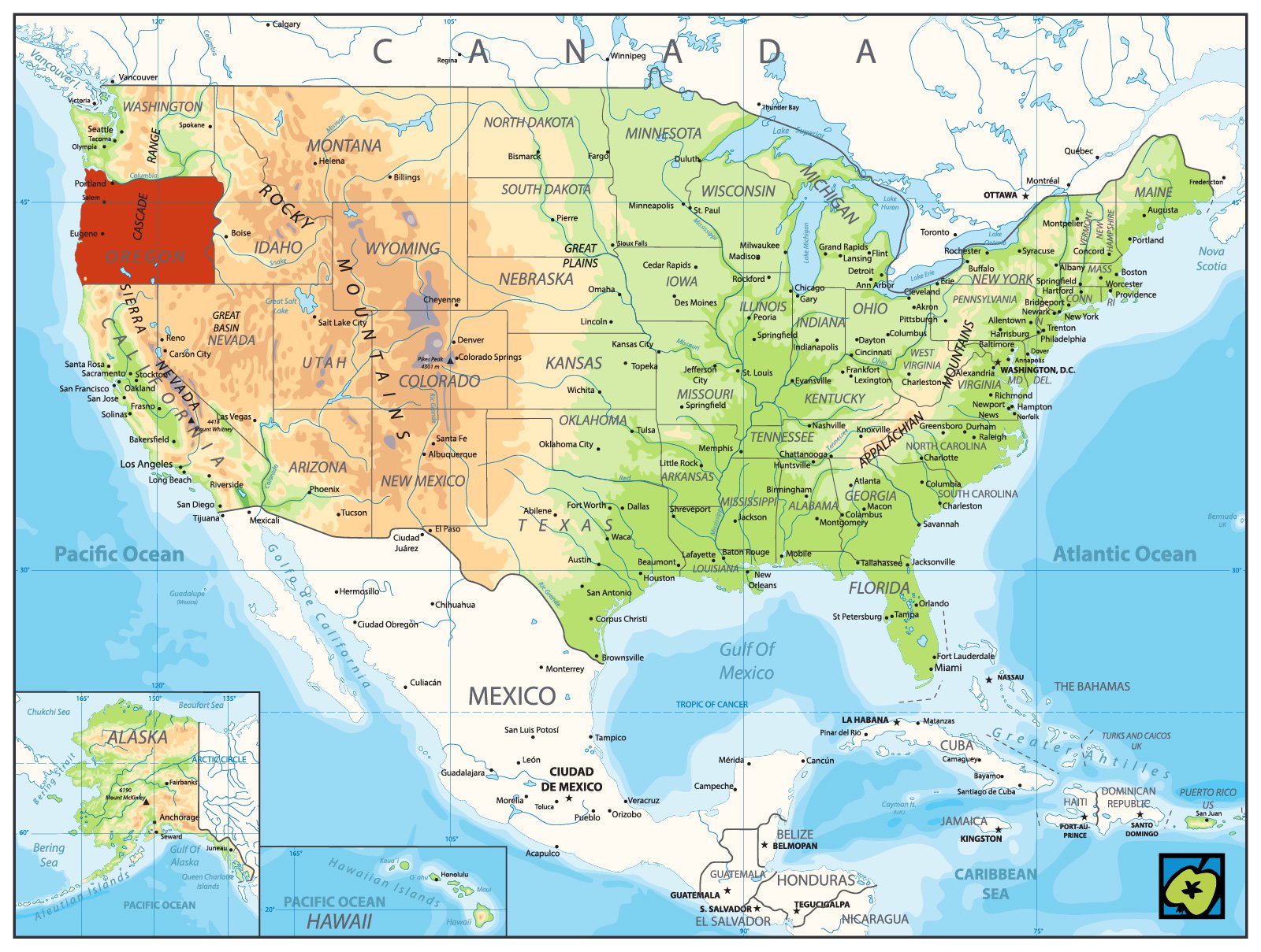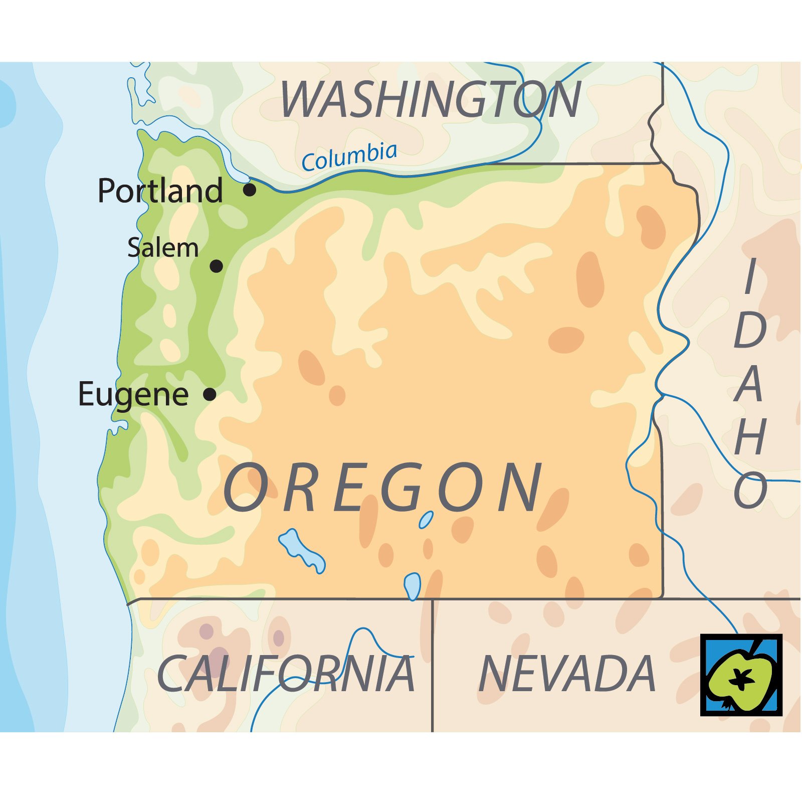 [Origen], tradiční zkratka Oreg., poštovní zkratka OR – členský stát USA na severozápadě u Tichého oceánu, 251 180 km2, 4 241 500 obyvatel (1.4.2020), hlavní město Salem. Hornatý stát (Pobřežní pásmo, Kaskádové pohoří, Kolumbijská plošina). Těžba dřeva, zemědělství (pšenice, ovocnářství a zelinářství), lov ryb, krabů. Průmysl těžební (rudy neželezných a vzácných kovů, zvláště niklu), textilní, sportovních potřeb. V Kongresu USA má 2 senátory a 5 poslanců. Pobřeží prozkoumáno britskými expedicemi J. Cooka a G. Vancouvera, vnitrozemí Američany M. Lewisem (1774-1809) a W. Clarkem (1770-1838). V letech 1818-34 území okupováno Velkou Británií a USA, roku 1834 vytvořeno teritorium Oregonu, k jeho osídlení významně přispěla Oregonská stezka. Roku 1853 bylo teritorium redukováno na dnešní rozsah a roku 1859 se stalo 33. státem USA.