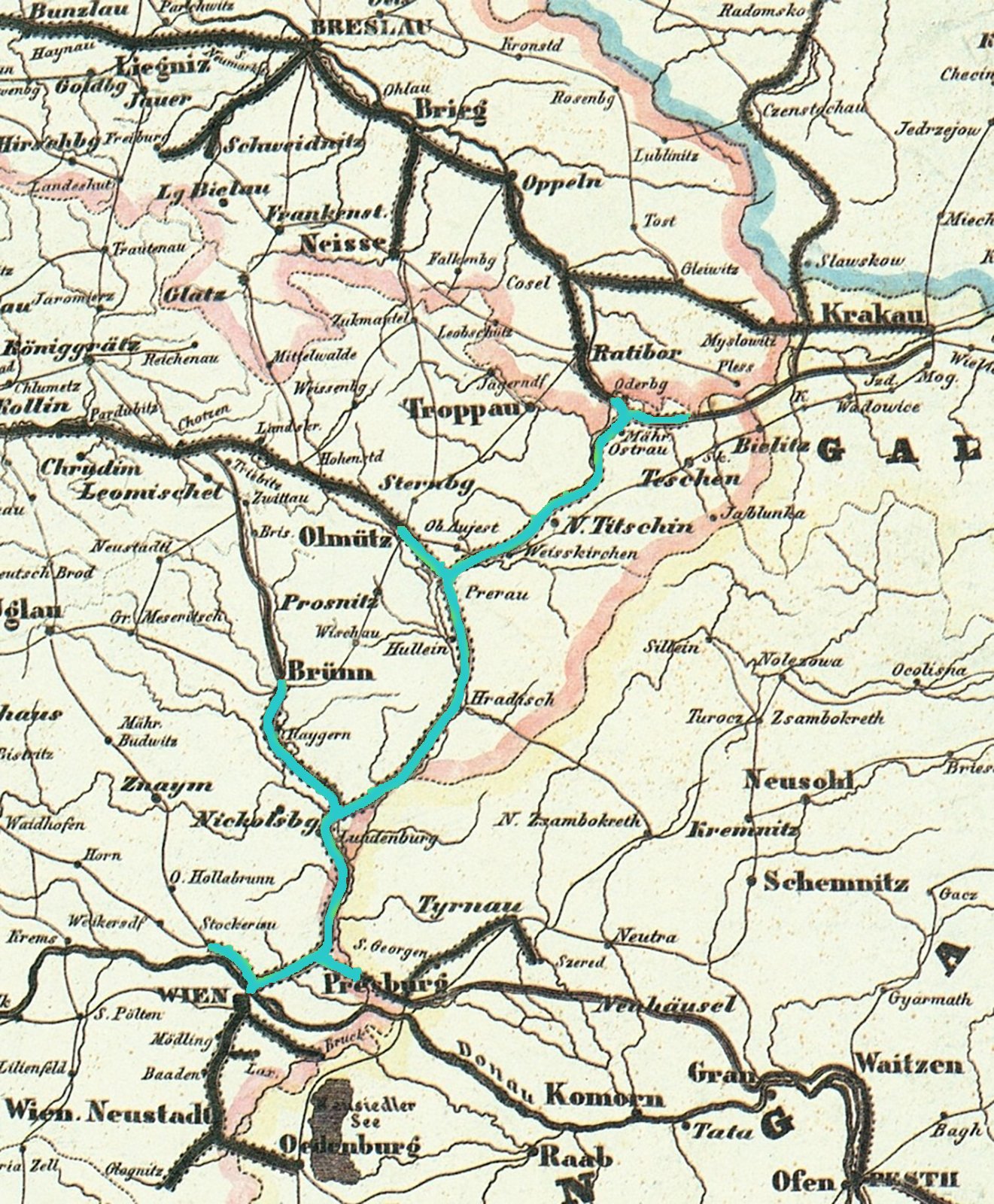 Nejstarší parní železnice císaře Ferdinanda I. v bývalém Rakouském císařství. Koncese byla udělena v roce 1836, společnost vytvořena roku 1836. První parní provoz začal dne 23.11.1837 na trati Floridsdorf–Wagram. Ještě před zprovozněním celého traťového úseku Vídeň–Brno, byl 15.12.1838 byl uveden do provozu 15 km dlouhý izolovaný úsek Brno–Rajhrad jako trať pro tzv. zábavní vlaky. Tento úsek se stal první železniční tratí na území Čech, Moravy a Slezska. Osobní doprava Vídeň–Brno byla zahájena 7.7.1839 (144 km), Břeclav–Přerov a Vídeň–Olomouc od roku 1841, do Bohumína v roce 1847. Tato dráha zavedla v roce 1844 první noční provoz. Roku 1906 byla zestátněna.