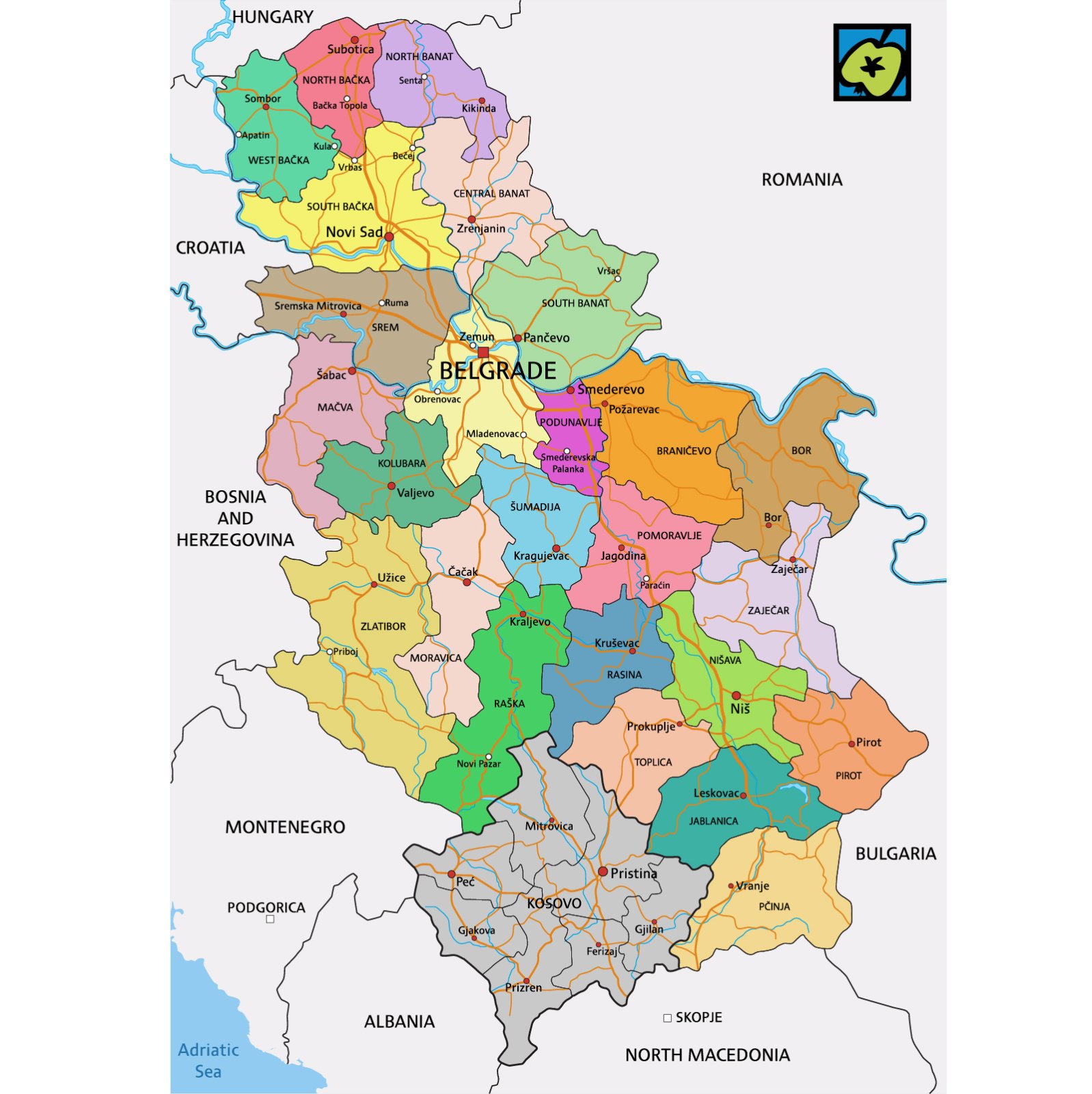 Administrativní dělení: 3 oblasti (Srbsko, Kosovao, Vojvodina)