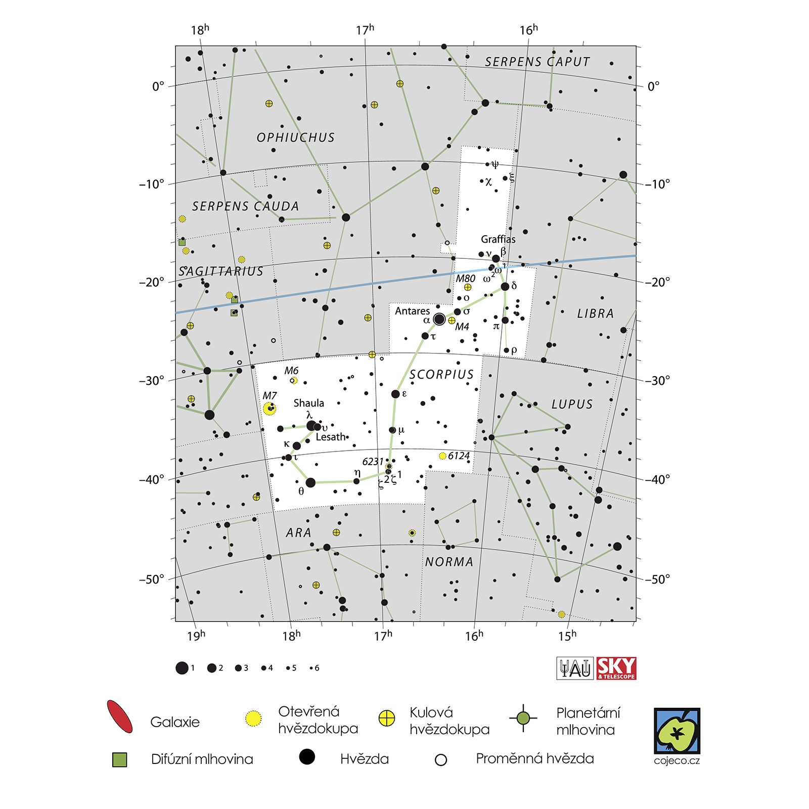 Astronomie, Scorpius – souhvězdí zvěrokruhu, v České republice částečně viditelné. Nejjasnější hvězda je Antares.