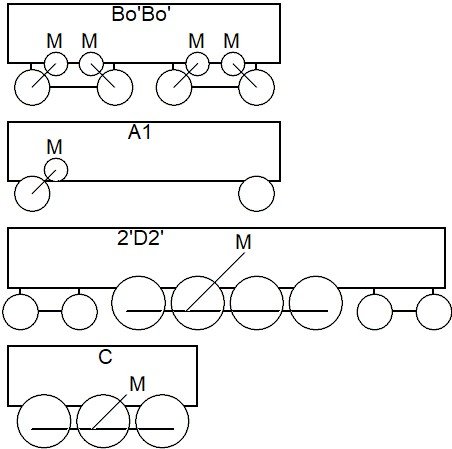 Systém značení uspořádání podvozku lokomotiv, značí se odpředu dozadu.