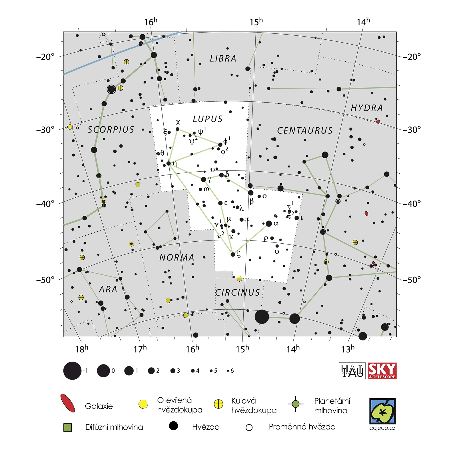 Astronomie, Lupus, souhvězdí jižní oblohy, jehož část je v České republice viditelná v létě.