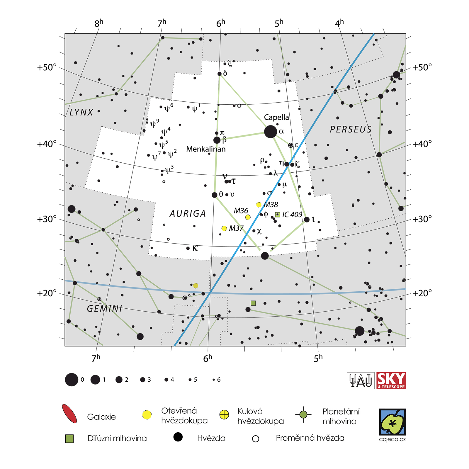 Astronomie, Auriga – souhvězdí zimní oblohy, jehož část je v České republice cirkumpolární.