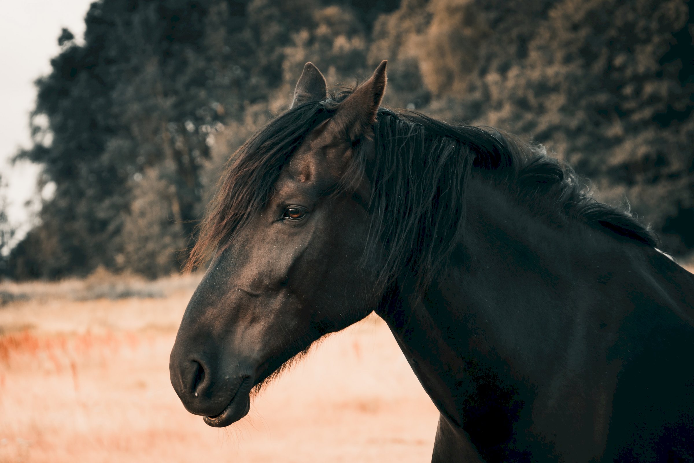 Černě zbarvený kůň, mohou mu na těle prosvítat hnědá místa.